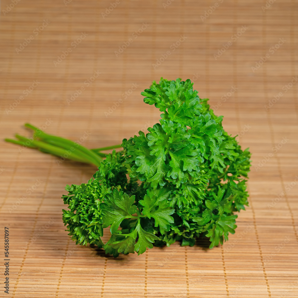 Petersilie, Petroselinum crispum, in einer Nahaufnahme