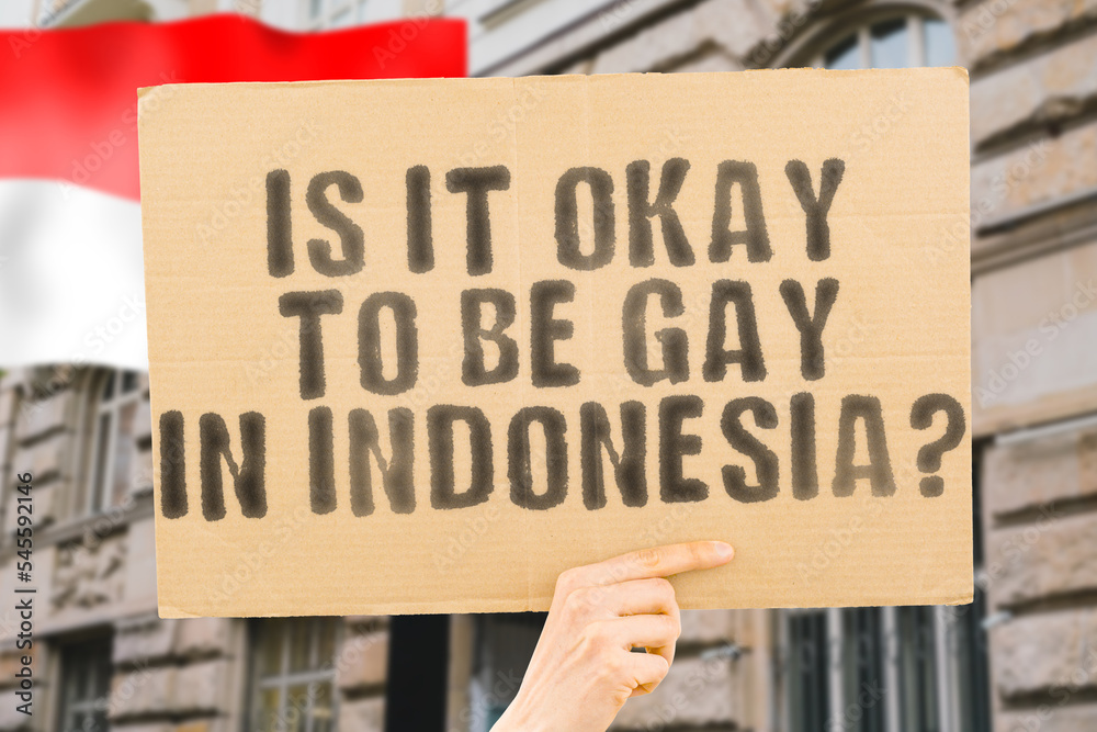 The question " Is it okay to be gay in Indonesia? " is on a banner in men's hands with blurred background. Friendly. Passionate. Contact. Date. Dating. Lover. Partner. Boyfriend. Pleasant. Approval