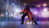 Couple dancers perform latin dance on large professional stage. Ballroom dancing.