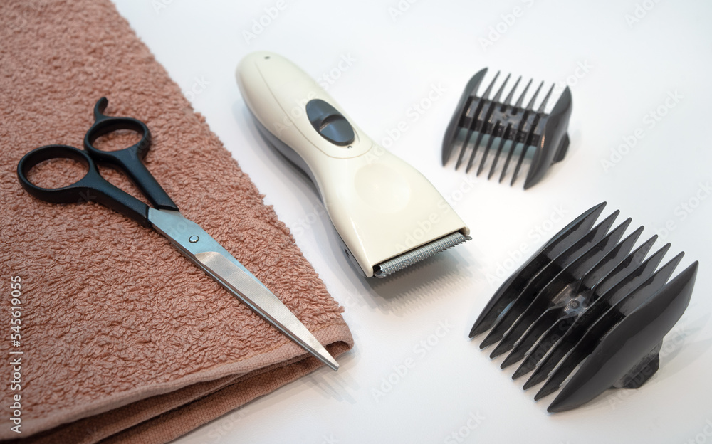 Hairdressing salon.A hair clipper with attachments and scissors on the table. Barber's kit. Hair cutting at the master.