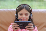 Portrait of a happy 11-year-old girl, playing a game on a smartphone with headphones with a microphone, sitting in a leather chair. Concept: gambling addiction, online learning.