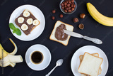 Chocolate cream bread, banana and coffee cup on the black background. Breakfast. Top view.