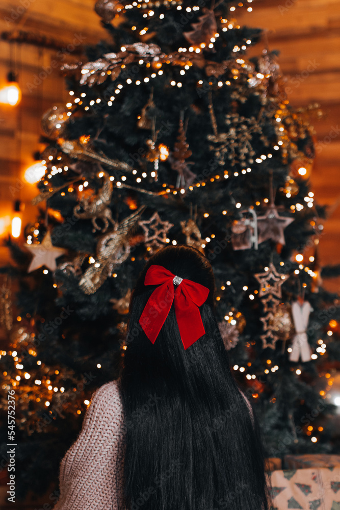 A brunette woman with a red bow in her hair sitting near a Christmas tree with golden magic decorations. New Year festive holiday concept