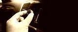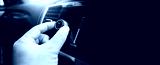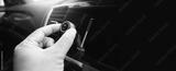 The driver hand is turning up or down the volume of the car music player or radio, panoramic banner with copy space on black background