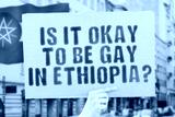 The question " Is it okay to be gay in Ethiopia? " is on a banner in men's hands with blurred background. Friendly. Passionate. Contact. Date. Dating. Lover. Partner. Boyfriend. Pleasant. Approval