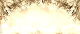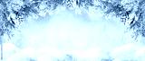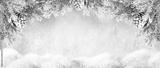Beautiful Winter Landscape with snovy Fir Tree Branches and Cones in Snowy Forest. Christmas and New Year greeting card. Winter banner with copy space.