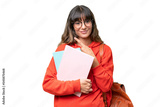 Young student caucasian woman over isolated background pointing to the side to present a product