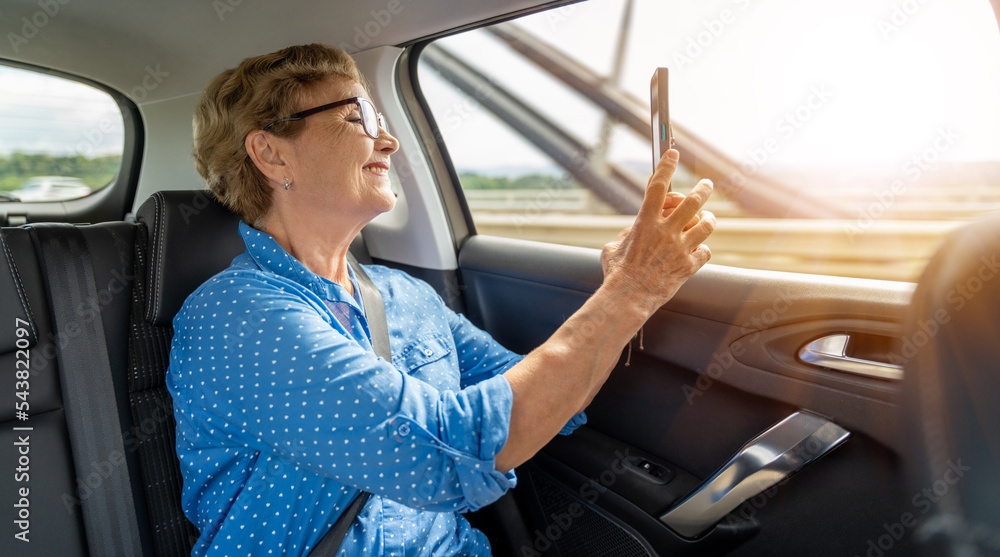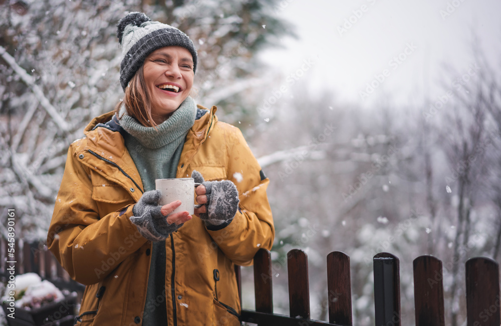 Young happy adult caucasian woman smiling in hat and yellow jacket enjoying tea in a mug with snowfall on the terrace