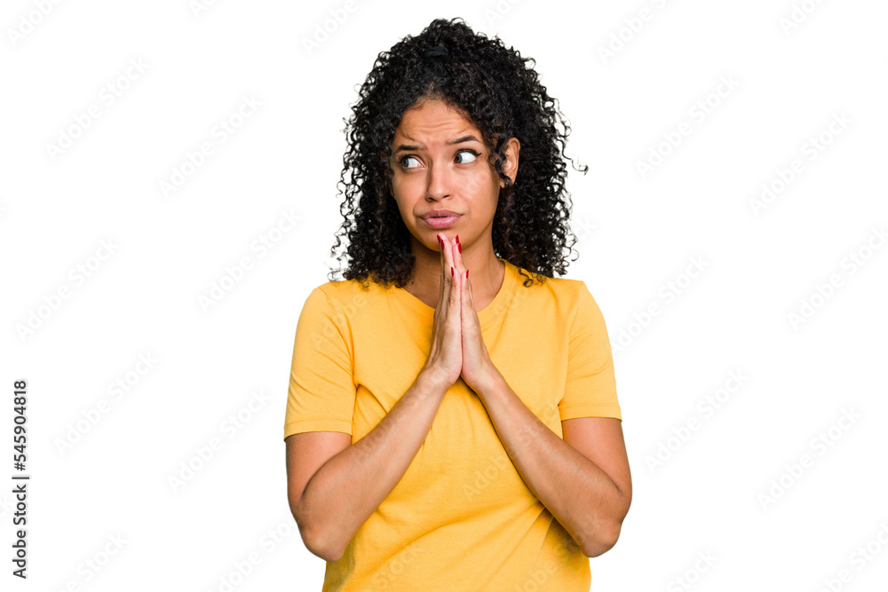 Young cute brazilian woman isolated praying, showing devotion, religious person looking for divine inspiration.