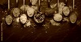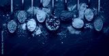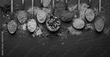 Various seasonings and spices on black stone plate