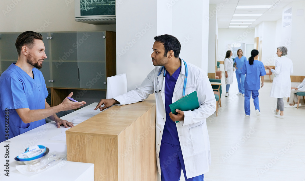 Medical assistant on duty talking with Indian doctor while working day standing near reception desk at lobby of hospital