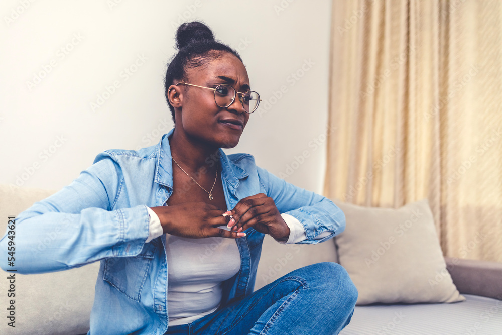 Divorce concept. Gold wedding ring in hand of depressed african american woman, selective focus. Gold wedding ring in hand of upset black woman.
