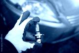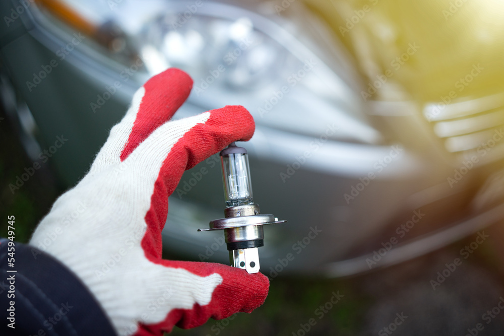 Replacement of the low beam lamp in the car.A gloved hand holds a glass car lamp against the background of a car. Workshop for the repair of automotive optics.