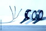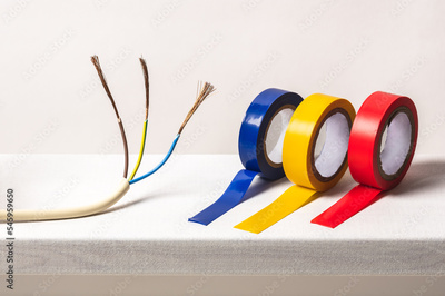Insulations in brown, blue and yellow-green color with flexible stranded wires. Bare copper wires and multi-colored electrical tape on a white background.