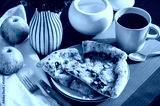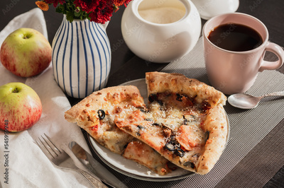 Pizza for breakfast and a cup of coffee on the table. Breakfast at home.
