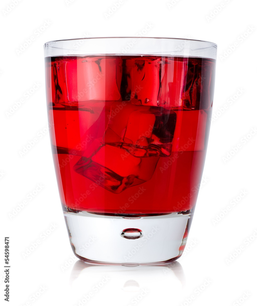 Red drink with ice cubes in a glass
