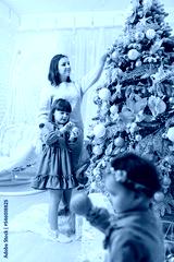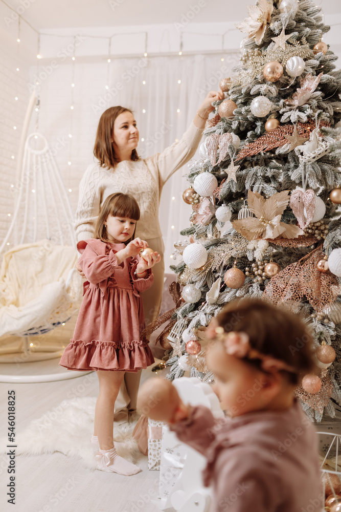 Pretty smiling woman with adorable two daughters decorate Christmas tree at home. Joyful little girls with mother spend winter holidays, enjoy happy moments, childhood and motherhood concept.