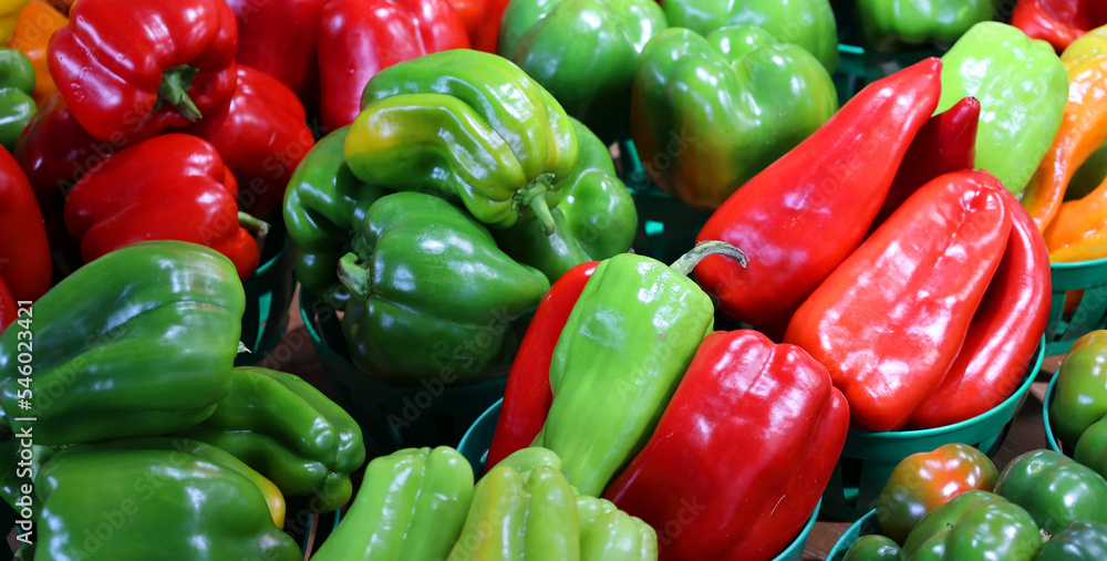 Fresh organic bell peppers capsicum on display for sale at local farmer's market departmental store.