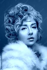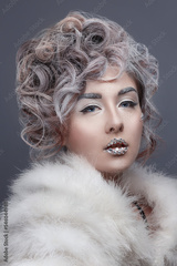 Beautiful fashion model girl with snow hair style and make up. Winter Queen. Winter Beauty.