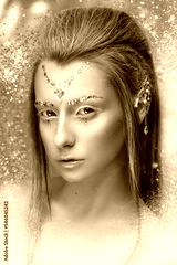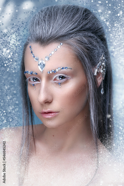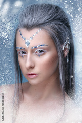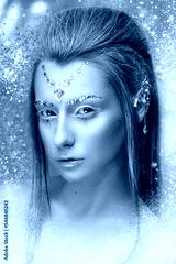 Close-up portrait of mysterious elf girl with silver long hair wearing silver tiara on blue fairy background