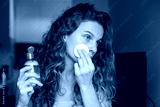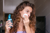 Curly woman with piercing removing makeup, holds blue bottle and cotton pads near face.