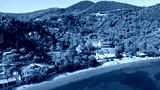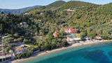 Aerial drone photo of famous small bay and beach with crystal clear sea and caves of Desimi near Nidri in island of Lefkada, Ionian, Greece