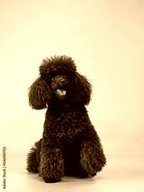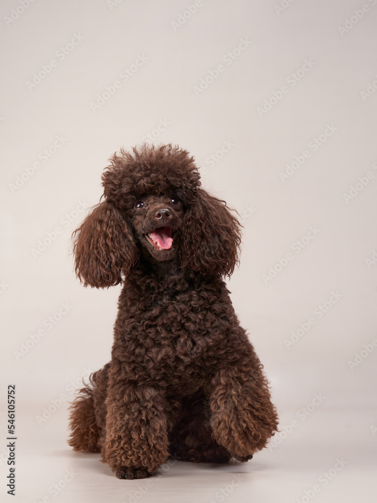 curly little poodle on a beige background. Portrait of a happy pet in the studio