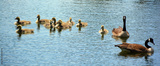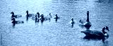 A family of mallard ducks, mother and father duck and ducklings swim in the water.