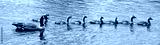 A family of mallard ducks, mother and father duck and ducklings swim in the water.