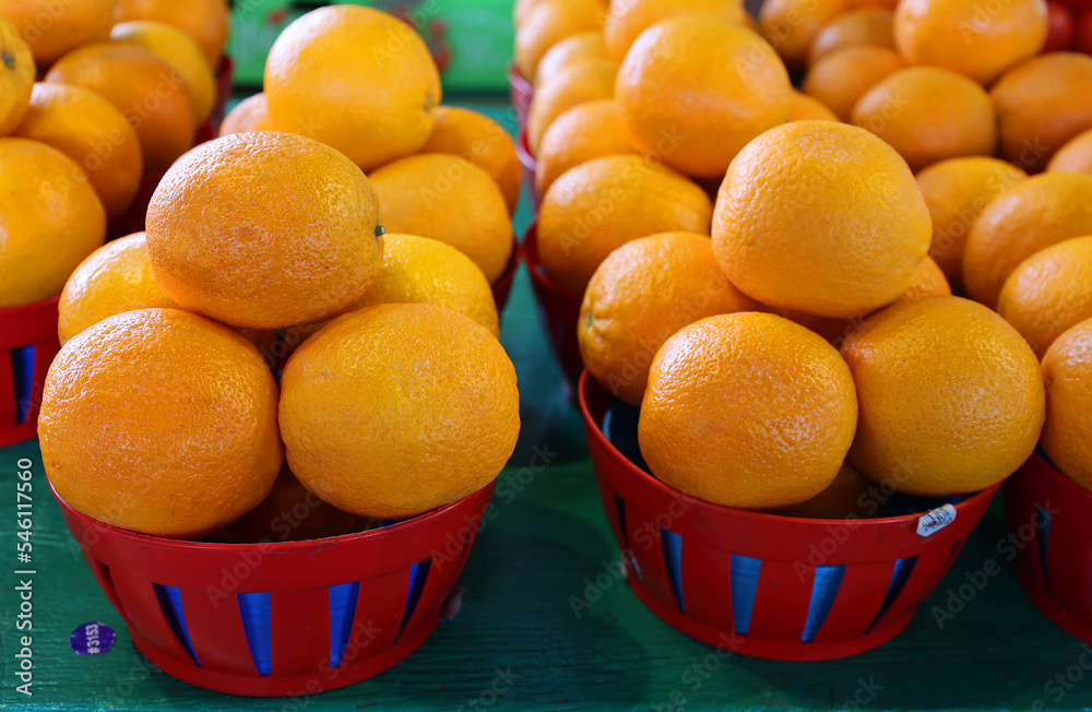 Orange fruit background. Closeup of many oranges on a fruit shop in market of Thailand. Fresh orange for sale in supermarket.