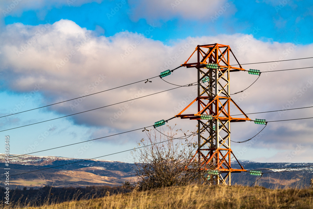 Power towers in farm fields scenery