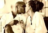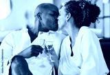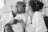 Black couple kiss at spa for wellness, champagne and love with romance for stress relief, celebration of relationship and bonding. Black man, black woman and anniversary getaway, toast with drink.