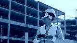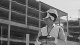 Professional drone operator in virtual reality helmet standing in front of construction site. Builder holding remote controller. Office building and crane background.