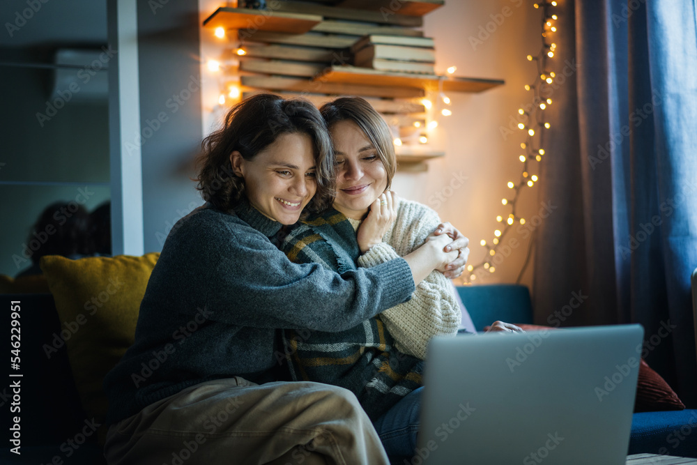 Cheerful cute lesbian couple two young women hugging in warm sweaters sitting at home on the sofa in front of a laptop