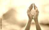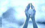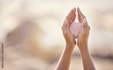 Woman, crystal hands and zen outdoor in nature for healing wellness, mindfulness or peace with spirit rock. Rose quartz, energy stone or calm spiritual meditation for growth, health or relax for girl