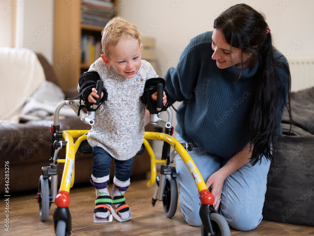 Mother assisting son with walking