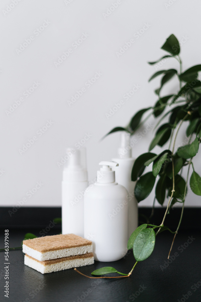 different cleaning supplies in containers and sponge scrubber on table