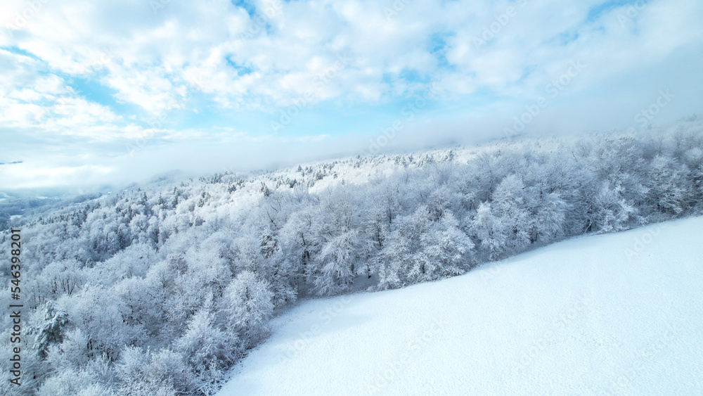 AERIAL: Enchanting view of hilly countryside covered with freshly fallen snow