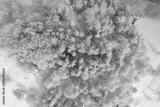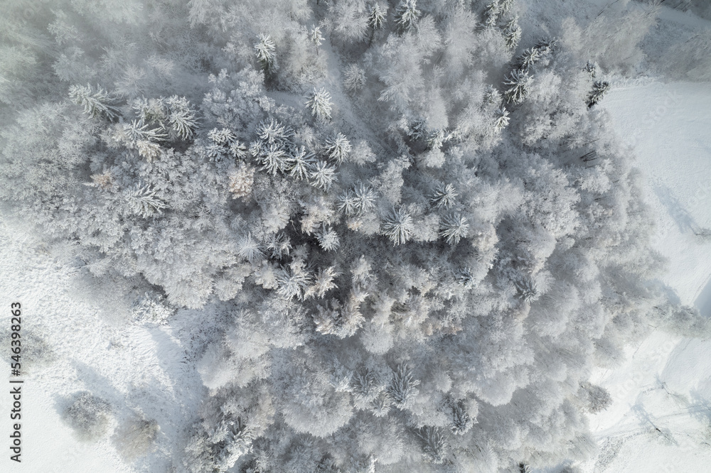 AERIAL TOP DOWN: Beautiful view of lush forest treetops covered with fresh snow