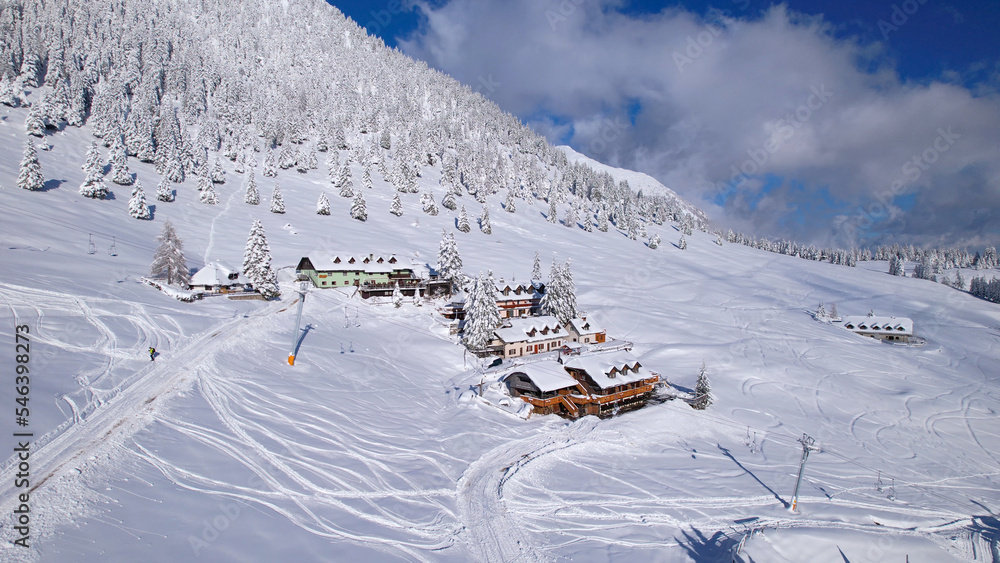 AERIAL Idyllic view of mountain chalets in the middle of snowy alpine ski resort