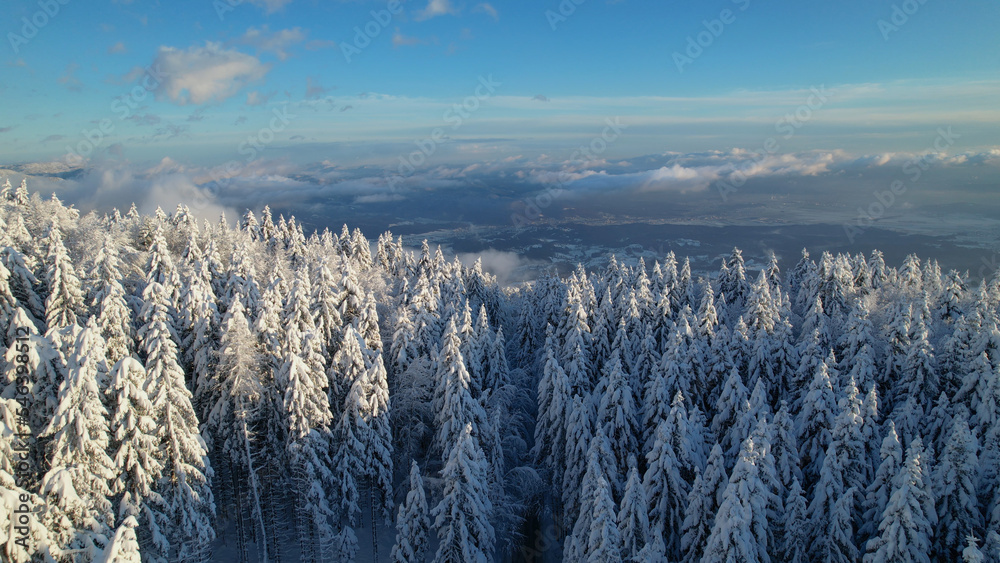AERIAL: View over snow-covered spruce trees towards white valley after snowfall