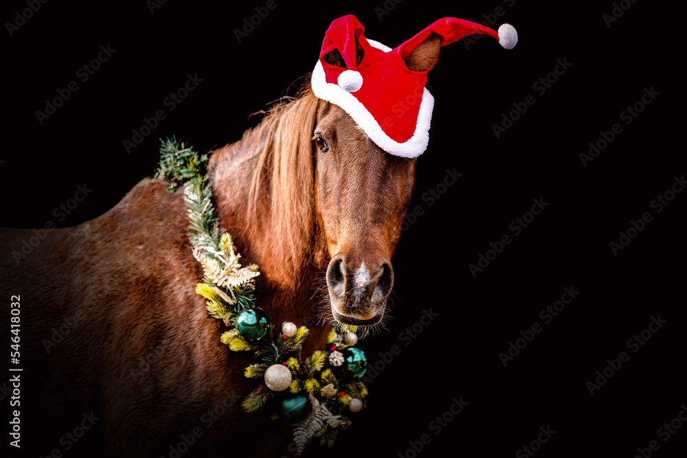 Portrait of a a horse wearing festive christmas decorations in front of a dark background