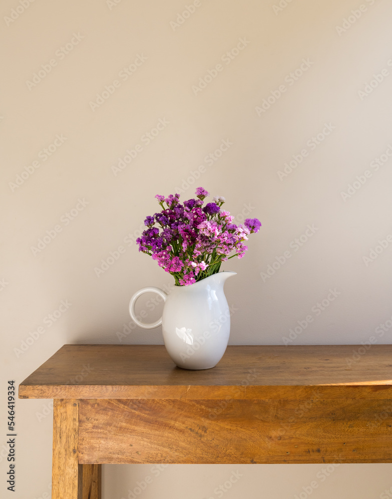 Vertical closeup of purple daisies in white vase on oak sidetable against beige wall (selective focus)