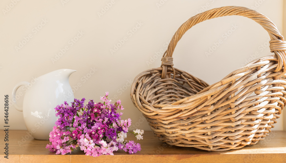 Brown wicker basket in bright sunlight on shelf wth purple daisies and white jug in background (selective focus)