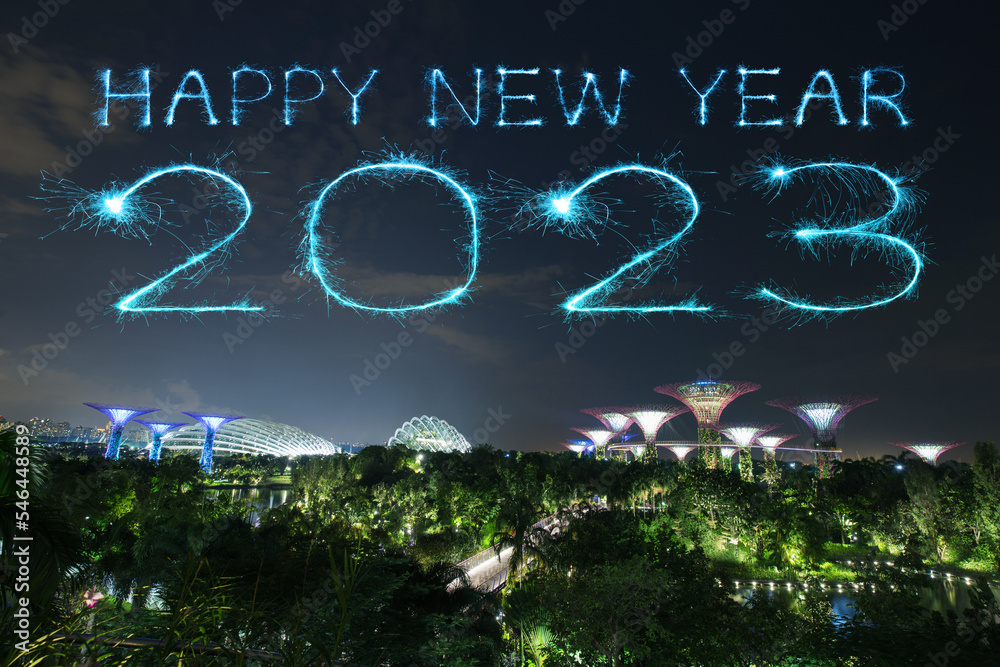 2023 Happy New Year fireworks over Singapore cityscape at night