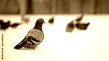 A domestic pigeon on white snow in winter. Urban birds in the snow.A blue pigeon.