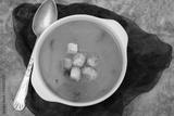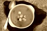 Vegetable cream soup with dry bread in white bowl