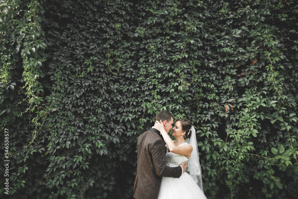 Stylish couple of happy newlyweds walking in the park on their wedding day with bouquet