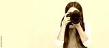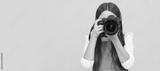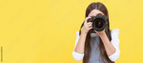 happy teen girl photographer taking picture with digital photo camera, copy space, photographing. Child photographer with camera, horizontal poster, banner with copy space.