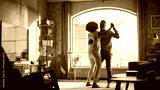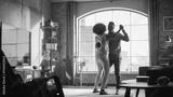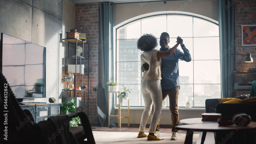 Happy Black Couple Dances in the Living Room. Cheerful Girlfriend and Boyfriend Enjoy True Love, Good Mood and Energetic Music. Having Fun at Home. Stylish Interior and Sunny Day.